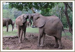 Two bull elephants made their way to the orphans while they were browsing in the bushes. Some of the orphans were unaware that the bulls were there while Zongoloni and Faraja realized saw them and were busy socializing with their wild friends. Faraja played pushing games with the wild bulls that were kind enough not to use their full strength with Faraja who is tiny in comparison to them. Ziwa teamed up with Faraja in an effort to try and defeat the wild bulls but they were unsuccessful.