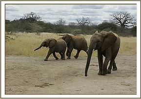 Another cloudy day, so the orphans spent time feeding, although Nasalot, Sidai Orok, Galana, Yatta and Olmalo took time off to dust bathe. Selengai led the orphans to the mudbath, where they encountered a troupe of baboons in the trees, making a lot of noise, which puzzled the orphans for a while until one dropped down. Yatta and Mulika charged, trumpeting, which sent the baboon rapidly up another tree, frustrating his attackers. However, all settled down, knowing that it was only the baboons who had made such a lot of noise.