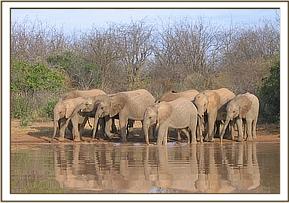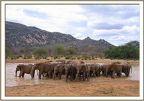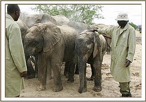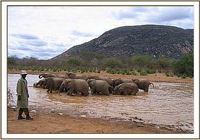 The orphans playfully “bumped” each other as they headed for the water trough this morning, followed by the youngsters play games as they awaited the signal to leave. They all enjoyed a spectacular wallow at mudbath hour, because it had turned hot.