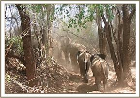 As the orphans went into the bush, they formed a long line behind Yatta and Mulika, swinging their trunks happily from side to side. Once at the browsing place, the boys, namely Tomboi, Buchuma, Ndomot and Madiba enjoyed pushjing one another until Tomboi tried to mount onto one of them, which angered the other three and broke up the game.