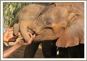 Suguta is beginning to be selective about the Keepers. Today at the mudbath she kept moving from one Keeper to the other, looking for the one who was with her during the night. The Keeper she wanted was with the Older Group, and this upset her so much that she refused the milk. This seems to be a new trend. She wants to be fed by the Keeper who was with her during the night!