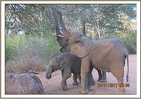 In the morning, after munching on Lucerne, the group were at the waterhole drinking while Sonje had a good scratch against the loading bay. Monkeys with young came to the water troughs for a drink but were quickly blocked by Ziwa and some of the other boys. Trumpeting and charging ensued, Quanza was especially loud which encouraged the other orphans to join in and they drove the monkeys away. The monkeys were jumping about and hid in tall trees, they were too quick for the keepers who tried to chase them off. Murera and Sonje with their baby Mwashoti were clearly protecting their keepers and keeping them safe.