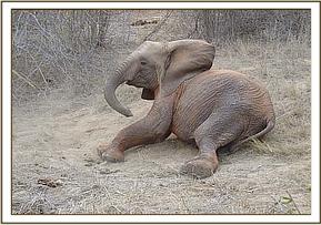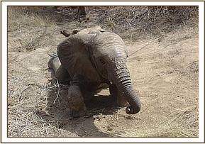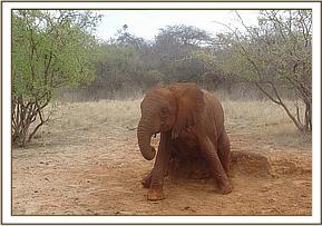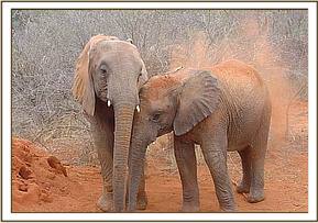 At 6 a.m. Taita and Tomboi enjoyed a shoving match. Later Selengai was frightened by a Rock Hyrax, but gathered courage, and managed a trumpet which sent the hyrax into the rocks. She was elated having done this, and gambolled towards Mulika as though to report what she had achieved! The orphans had a wonderful mudbath today, when Wendi and Tomboi played in the water.