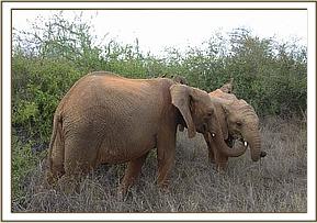 AT 8 a.m. Kinna came face to face with two male warthogs who were busy digging up roots. She rushed around, trumpeting and knocking down bushes, until Nasalot came to back her up, but upon noticing that the warthogs had left, he and Kinna entwined trunks, in a congratulatory gesture.