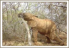 Having left the Stockades, Olmalo spotted a dikdik, and plucked up sufficient courage to give chase, trumpeting as she disappeared into the thicket. Yatta panicked when Olmalo failed to return, and set off in search. Olmalo bellowed in the distance, which drew the attention of the entire group who also set off in search, meeting up with Yatta and Olmalo returning.