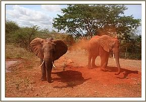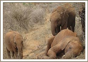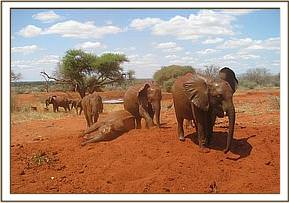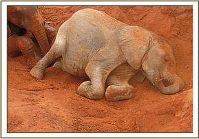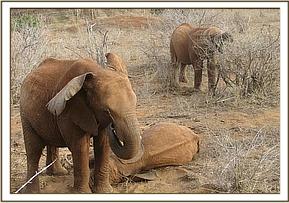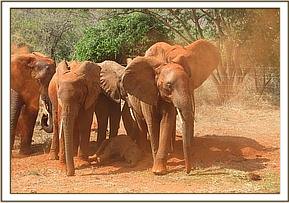 The Keepers went out early to collect a pile of red soil for the orphans to enjoy at their noon mudbath. This became a playing paradise for them, Taveta, Mzima and Siria enjoying a rolling down game, Siria taking advantage of Lempaute as she lay down. They fed close to the waterhole for the rest of the day.