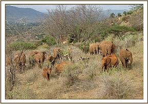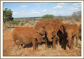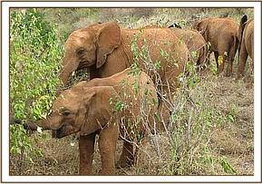 After their morning milk feed, the orphans enjoyed playing in a pile of soft red earth, after which they headed out to browse. With the Park drying out rapidly, they fed without interruption until mudbath time, after which they brosed their way back home to the Stockades in the evening, led by Lesanju, their Matriarch.
