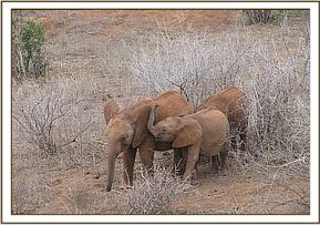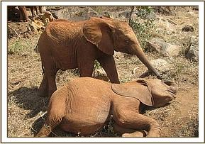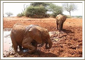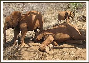 The orphans all enjoyed playing in the soft soil after their noon mudbath, but Kenia prevented little Kimana from joining in, perhaps fearful that he might be hurt by one of the others. Instead he comfortably suckled her ears until it was time for the group to embark on browsing for the remainder of the day.