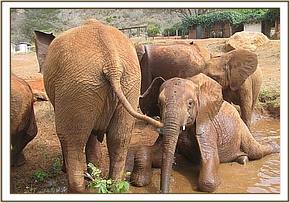 The orphans headed into the main Park in single file, charging and playing en route. At noon they all enjoyed the mudbath, Wasessa blocking Sinya from playing with Tassia by coming between the two each time Sinya made an attempt. In the afternoon they all fed around the waterhole until it was time to return in the evening.