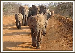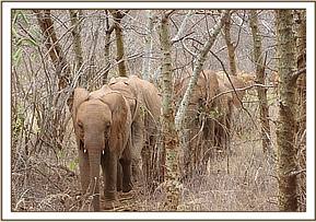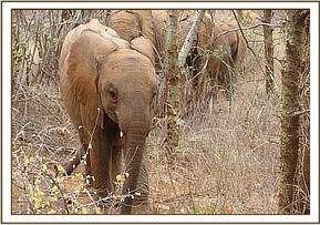 At 9 a.m. the Juniors were joined by Wendi, galena, Meibai, Sunyei, Galana, Lualeni, Kora, Sidai, Naserian, Madiba and Tomboi. The Ex orphans browsed with the babies for about half an hour and then, without the Keepers noticing, Wendi and her group made off with Kandecha. The Keepers only noticed the absence of Kandecha as the Juniors headed for the mudbath, where it was expected that Wendi would turn up with Kandecha in tow, but this did not happen. In the afternoon the Keepers tracked down Wendi’s group and found them near the junction to the airstrip. The Keepers called Kandecha, who responded eagerly since he had missed his noon milk feed. The Keepers led him back to where they had left the rest of the Juniors, Wendi and her group rumbling their dissatisfaction, having failed to abduct Kandecha.