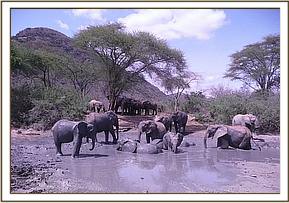 Ithumbah and Chaimu left ahead of Olare and the others, who were in no hurry to leave the Stockade compound today. However, all then streamed behind the three Leaders. By l0 a.m. it was very hot, so the orphans took to shade, and later enjoyed a wonderful mudbath, after which they felt more comfortable. Most of the afternoon was spent browsing quietly.