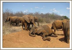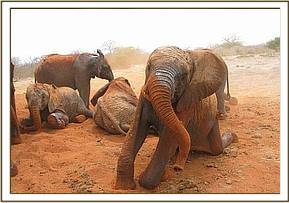 The orphans again browsed along the Kalovoto seasonal watercourse where Kilaguni and Ithumbah dug up roots. By noon it had turned very hot so all enjoyed the mudbath.