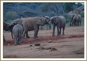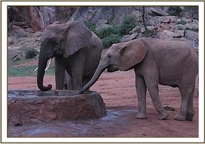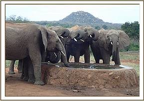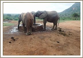At mudbath time, Half trunk and Rapsu were taking water at the mud bath water trough where they were joined by the juniors. Half trunk and Rapsu