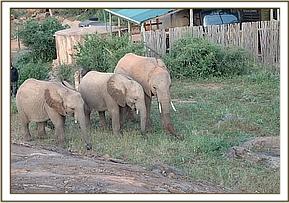 In the evening, before the orphans returned to the stockade, Mulika's, Yatta's and Lualeni's groups showed up at the stockade. As the orphans arrived, Chyulu and Loijuk tried to block Lemoyian with their trunks. Lemoyian complained bitterly making Loijuk and Chyulu escort him up to the entrance. The ex-orphans were in the company of five wild bulls and the boys had endless strength testing exercises at the stockade compound. Ololoo played with Meibai and later played with Taita, Napasha played with Challa as Buchuma played with Tomboi. Later, Taita mounted on Lenana as Orok tried to chase away a warthog that was coming to drink water. The warthog left Disappointed but returned when the ex-orphans disappeared into the bush.
