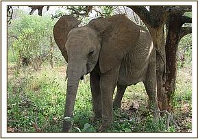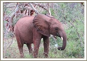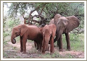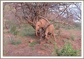 Lemoyian walked over to where Mutara was browsing and funnily enough Mutara didn't push him away, so this can only mean that she had some liking for Lemoyian as Mutara can be extremely grumpy at times. Kithaka, who was feeding some metres away, developed an itch behind his ears and opted to scratch the ear against a nearby tree whilst Vuria used his small tusks to dig soil to loosen it so that he could dust himself. Laragai entertained herself by sitting on her haunches and twisting her head sideways.