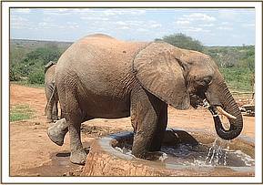 At mudbath time, Yatta's and Mulika's groups, in the company of Half trunk and five other wild elephants arrived earlier than the orphans but Kora, Kamboyo and Ithumbah were missing. Soon when the juniors arrived, they were welcomed by Lenana and Sidai. One of the wild bulls was nervous and kept on charging, directing his anger to anything in sight. Teleki, Narok and Bongo joined some ex-orphans in wallowing while Kithaka, Barsilinga and Lemoyian went straight to the water trough were they squeezed themselves in the midst of the ex-orphans to get water. After drinking, Kithaka was escorted away by Chyulu. After mudbath, Teleki interacted with Nasalot before leaving to play with Yetu.
