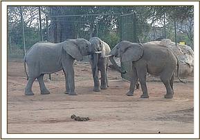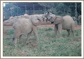 Outside the stockade compound, Orwa played with Ololoo while Shukuru communicated to Barsilinga by inserting her trunk into Barsilinga's mouth.