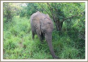 In the early morning Sonje had a plan to go to a new area where there are plants with tubers on their roots. As Sonje was searching through the bushes she found a fallen tree that was pushed down by wild elephants and finished almost a whole branch. The bent tree was producing some nice smells and Sonje went for its roots enjoying the tubers.