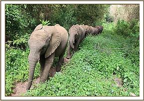 Murera almost lost the other orphans as they continued to walk into the forest. When Murera trumpeted and rumbled to call Sonje to her side, Sonje responded in style with big rumbles followed by loud trumpeting from the bushes. Within no time, all the orphans were running to collect Murera and