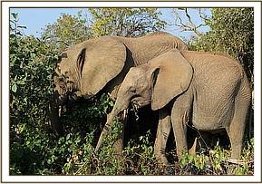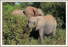 vegetation. Sonje and Murera took their baby boy Balguda immediately after they finished their milk bottle. Sonje was trying to comfort Balguda who was pushed by Zongoloni, because of some much loved acacia pods that were near him. She brought Balguda to her chest and patted him with her trunk like a very young baby with his mother.