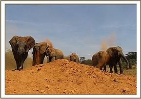 stop there as after wallowing Zongoloni, Quanza and Limalima took the babies to the dust bath and the brown soil quickly changed the body colour to