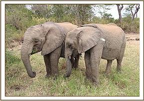 Quanza left the stockade looking for somewhere to scratch but decided to use her trunk below her chest after failing to find a good scratching rock or tree around her. The playful babies then went to the tall greener grasslands to play and browse. Some were rolling on the grass, but the naughty boys, led by Jasiri and Ngasha, began pushing games to show how strong they were. As they were pushing, Faraja saw his friend Ngasha being pushed so hard that Jasiri over powered him. Faraja ran to help his roommate and friend from Jasiri who was getting very rough with Ngasha and together they defeated Jasiri.