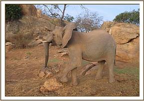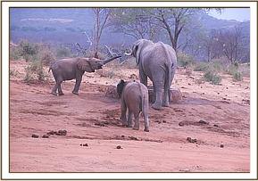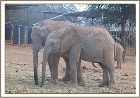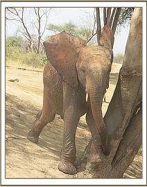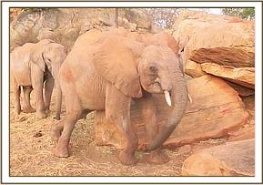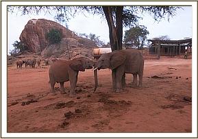 Today Sities left the stockade in a charging mood. She trumpeted as she ran towards the water trough, and carried on beyond, circling with her head held high and her tail aloft. Her charging and trumpeting attracted Laragai who then joined in kicking up dust and charging in circles. Laragai pushed Bomani unsuspectingly as he was standing in her way. Bomani didn't react in any way but just accepted what had befallen him since by attempting to revenge would land him into trouble with Laragai who has been known to pack a mean punch. Kainuk participated in soil dusting and later scratched her buttocks on a nearby rock dislodging any unwanted ticks.