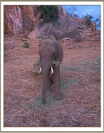 The orphans settled for lucerne immediately after leaving the stockade.  Shukuru scratched her belly on the rock while Bongo took a flake of lucerne and moved some metres away where he enjoyed feeding on it uninterupted. Orwa passed by and Bongo thought that Orwa was coming for his Lucerne so he positioned himself in an aggressive stance, with spread ears and head raised, only to see Orwa walk by.  It might be that Orwa saw his stance and thought better of it and then pretended he never had any ill intent. Shukuru tried to steal some of Kainuks pile of Lucerne  forcing her to pick her pile and move else where.