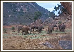 Lualeni, Ololoo, Tomboi, Chaimu, Kilaguni and a junior wild bull reported at the stockade early before the orphans were let out. The reason behind the early reporting of Lualeni was to make sure that they were included in the ration of lucerne.  Yatta and her group reported when the orphans had already finished the lucerne and were preparing to leave for browsing. Kainuk and Orwa spent some time scratching on the nearby rocks.  At the browsing field, Shukuru came across loose soil and spent much time dust bathing with Mutara joining in.  They then resorted to lying in the soft cool dust for a short nap.  Orwa who was feeding close by came forward and scratched his belly against Mutara.  Mutara seemed to like the attention and remained lying down while Orwa enjoyed his scratch.    Sities developed an itchy ear and since she wasn't close to any tree she used Garzi as a scratching post by scratching against him rigoriously.  Garzi understood it was an emergency and let her continue understanding her predicament. Shortly after taking the the mid day milk, the juniors were joined by Suguta and her group. Suguta and her group have been spending time further a field and have not been arriving at the stockades predictably every day, but while together Kibo taught Orwa some pushing tactics while Murka threatened to push Laragai when Laragai happened to pass too close to her.  In the afternoon, the temperatures were low and the orphans browsed calmly throughout enjoying the company of the semi independent orphans. Shortly before returning back to the stockade, Orwa knelt down with his front legs to try and pull a shrub out of the ground.  He was unable to do it standing so resorted to another style.  It was obviously something her really wanted, and finally he was successful.   In the evening only Lualeni showed up at the stockades to take her fill of water, without Kilaguni or Ololoo.  The Keepers are suspicious of her intentions.  Lualeni likes to snatch our dependent babies and whisk them off for nights out.