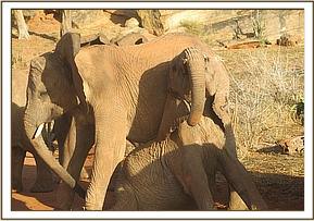 Vuria and Garzi had a great time today rolling on the loose soil they had come across. Mutara rumbled and all the orphans followed her up to the Kanziku area where they settled to browse.