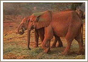 The orphans settled for lucerne soon after leaving the stockade.  Mutara took the biggest pile and moved away from her colleagues. Each time a colleague passed by she would throw her trunk in defence of her pile.  Kanjoro who had also taken a pile, he used back kicks to defend his pile. First to be affected was Narok who while pressing behind Kanjoro and received a sharp kick to her belly. Narok didn't complain but passed hoping that one day she will be strong enough to revenge. Teleki was also kicked when he tried to snatch some lucerne from Kanjoro. As the orphans were preparing to leave, Yatta and Mulika herds of ex orphans reported and started picking the leftovers of Lucerne and the stockades were surrounded with over forty elephants. On the way to the browsing field, Bongo and Vuria engaged one another in a strength testing exercise. At the field, Garzi took some time to scratch his buttocks against a rock while Kanjoro resorted to some serious soil dusting.