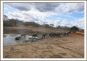 At eleven o'clock in the morning, the temperatures where extremely high and the muddy water of the wallow did not come a moment too soon as all the orphans charged into the water and there they spent a good long time cooling down, wallowing, and generally having a very good time together.   While still in water, Bongo and Vuria had a brief strength testing exercise that ended when Mutara called off the wallowing exercise through rumbling, and instantly all the orphans began to vacate the water.  Mutara led the group for soil dusting and later Shukuru went to scratch against a nearby tree as Teleki and Bongo queued patiently waiting for Shukuru to finish before having their turn on the same scratching tree. Laragai picked a piece of stick that she used to scratch her neck and then used the stick to reach difficult places and spent a good long time relieving herself of any itches. The afternoon was quiet as the orphans spent much of their time relaxing under trees.