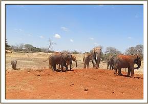 At mud bath time, the juniors were joined by ex orphans Wendi and Rapsu which was enjoyable for the little ones. Orwa was pierced by a thorn from and acacia branch that had fallen on the path where he was walking but he carefully with his trunk fingers pulled the thorn out without needing the assistance of his keepers.  He immediately then found a big tree to give himself a good scratch against.   Teleki, Laragai and Shukuru had a very prolonged wallowing session today, sensibly preferring to be in the water than out; Teleki the last to finally come out.  Rapsu who has grown into a very handsome big boy led the juniors to the big red soil mound and began to dust, with the little ones following his example and copying what he was doing.   Sities was standing close to Wendi and opted to scratch herself against Wendi who obliged.   Shukuru muddy and now dusted red went to finalize the ritual with a good scratch against a tree close to the soil dusting venue and Teleki, Bongo and Turkwel queued to do the same once she had finished. The scratching exercise was cut short when Wendi sidled up to use the same tree, and then out of respect for their elders the little ones gave way.   Once the orphans had filed their way home the ex orphans arrived at the stockades to catch up with everyone, and to take a good long drink.  Shortly before dark Suguta brought her whole group to drink so it was a full compliment of Ithumba orphans, dependent, semi dependent and ex orphans with the exception of Nasalot who remains on a walkabout.