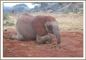 On the way to the mud bath, the Keepers counted the orphans and realized that one was missing. After cross checking, they found out that it was Bongo that had dodged them. Two Keepers went to look for Bongo while the rest took the present orphans to the mud bath. Bongo was located twenty minutes later and he was taken to the mud wallow to join his colleagues.  Bomani and Garzi were still in playful mood and they started a pushing game that didn't please Laragai prompting Laragai to push Garzi away. In the afternoon the dependent herd moved to feed further up Ithumba Hill, and Orwa browsed with his hind legs crossed in a casual stance while Narok and Laragai came across loose soil which they then spent a good long time dusting themselves with.  The babies then formed a line with Turkwel in the lead and headed back to their stockades, browsing along the way.