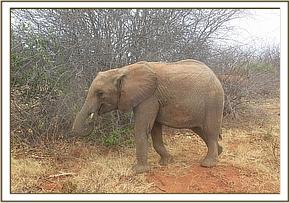 Today the sky was obscured by heavy rain clouds as the orphans left the stockade. While out in the bush Sities browsed close to Mutara and the orphans were in high spirits, anticipating the rain.  The weather kept on changing from cloudy to sunny.  Shukuru took time off from feeding today to perform the soil dusting when she found a nice patch of bare earth.  She later got back to her feet and joined Kanjoro to feed on the same bush.