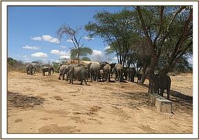 At mud bath time, only Bongo the water boy and Teleki participated in wallowing. The rest went up to the water trough where they spent allot of time in drinking water. Bongo joined them and as if he had not taken enough bath, he started splashing water behind her ears. Sities wasn't happy about what Bongo was doing and so she pointed him with her trunk to stop him from wasting water. Sities forgot that she is the worst together with Mutara when it comes to wasting water. they sometimes even get into the water trough and start kicking the water using their dirty feet. Bongo didn't take her seriously and did two more splashes then went to scratch against the nearby acacia trees where Teleki was still doing the same exercise. In the afternoon, the sun was hot and Sities, Narok and Kanjoro converged under a tree while continuously flapping their ears. On the way back to the stockade, Shukuru led the first group, Narok led the second group while bongo led the last group. Inside the stockade, Orwa pushed Teleki when he stepped on the coconut Orwa was feeding on.