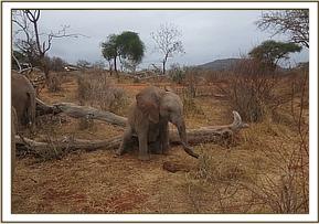 Surprisingly for early March it was drizzling in the morning when the orphans left the stockade. Following the chilly weather, Shukuru, Narok, Bomani and Garzi decided to start the day by scratching on the rocks at the stockade compound while Kainuk moved down where she did soil dusting and shortly later was joined by Bongo. At the browsing field, it was still drizzling and this prompted Sities to engage in a lone soil dusting game. She later scratched her belly on a tree that had been knocked down by a wild elephant. The ex orphans passed at the stockade compound at eight o'clock in the morning as they headed towards kalovoto. Clearly they had not gone far overnight and remained close to the stockades.   Later, the partially independent group led by Suguta reported at the stockade. Her herd were in good spirits and spent time with the dependent young.  Only Kilaguni and Chaimu were missing but showed up two hours later.  These two spend extended time together and are best friends. By the eleven o'clock milk feed time, the weather was still chilly and the orphans were not in a playful mood. After taking milk, the orphans headed to drink water and thereafter returned back to the browsing field. Later in the afternoon, it started to get warmer as the clouds obscuring the sky slowly cleared. This activated the mood of Bongo that was feeding close to Vuria and had a strength testing exercise with Vuria. When the sun got hotter, Shukuru went to stand under a tree as she continuously flapped her ears.