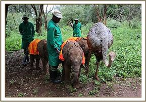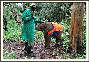 What a lovely day it has been for the keepers and their babies. They day started so well, bright and warm compared to the rainy days we have been experiencing recently. The older orphans had gone out to the park very early and the babies followed not long after. As a result of all the rain we have been having, the park is very green and thick with vegetation. In the afternoon after the visit we could not find Galla and by the 3pm milk feed we still could not find him. We thought he would remember the 3pm mil feed and turn up himself but that did not happen. All the orphans were grouped together with the keepers and even the keepers assigned to work in the compound were called out to come and look for him. Eventually he was found in the thick bush not far from where he had last been seen! A few minutes later Olsekki, Enkikwe, Boromoko and Siangiki also sneaked away into the thicket. They were found just as it was time to return home and when they saw the keepers they ran up to them in joy, for they knew it was milk feeding time and time to return home.