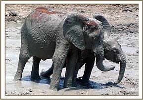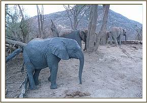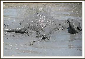 After taking a drink Ithumbah led the column out in single file east of the Stockades. As usual Kandecha led the way to the mudbath and milk venue and all enjoyed cooling themselves down in the mud, taking a dust-bath to dry themselves off before heading out to feed again.