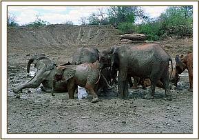 The orphans left the Stockades early as usual, but as the temperature soared, they took to shade. Five wild dogs passed close by, not at all bothered by the presence of either the Keepers or the elephants. The orphans all participated fully in the mudbath, Kilaguni putting on a particularly spectacular performance, remaining in the wallow for l0 minutes after the others had left. Sabachi and Suguta rumbled a call but he took his time, and eventually caught up with them out in the bush.