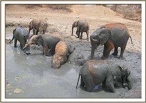 As the Juniors emerged in the morning, they joined some wild elephants at the Stockade water trough, who were also taking a drink and later left for the field. At the mudbath Kalama was the star Player, the only one to cover herself totally in the mud, after which all enjoyed a dustbath. Two huge wild bulls came for the mudbath just as the orphans were preparing to head back out to browse.