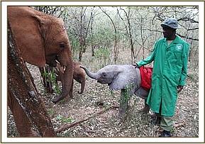 The presence of a newcomer in the Nursery (Ngasha rescued on the 30th September, did not escape the notice of Mutara, Turkwel, Sities and Tano, who hurried to his stable as soon as they were let out in the morning. Their presence outside his Stockade door reassured him, but he remained aggressive towards the Keepers, understandable in view of what made him an orphan. Little Rukinga has now completed his 5th day in the Nursery, and so far, is doing well. Naipoki is giving him a lot of attention when Mutara divides her time between him and little Kithaka, of whom she is very fond.