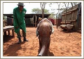 Ngasha has calmed down considerably having been exposed to the other Nursery elephants. This is his third day in the Nursery, and he is taking his milk well. At the 3 p.m. feed he was allowed out of the Stockade to join the other orphans, sandwiched between the Big Females. He tried to escape, but was closely followed by Mutara, Shukuru and Kilabasi, reinforced by the Keepers, all of whom rounded him up and returned him to the rest of the herd. After being comforted by the Big females, he settled down.