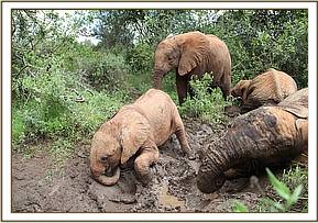 Today, all the Staff had to attend an anti-terrorist Meeting organized by KWS in response to the Al Shabaab terrorism of late. Because of this, there were fewer Keepers looking after the orphans, which gave Teleki the opportunity to sneak off on his own, without turning up for the public mudbath hour. The Keepers searched for him in vain, but he turned up at the mudbath at 1.40 p.m. and enjoyed a wallow. He did not seem to miss his peers at all!