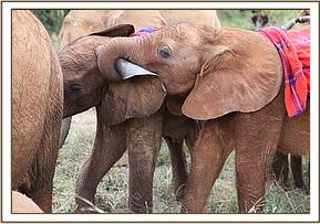 Rukinga is taking the strain with his teething, and was put on a drip after the afternoon feed. He has loose stools, and although still taking all his milk, does not have his usual appetite and takes it slowly. Kithaka is now the Star Player at the Public Viewing Hour, rolling in the dust and showing off to the crowd who really enjoy him because of his tiny size. At the evening foster-parent hour he engaged his Keeper in a Pushing Match, then rolling on the floor, and charging the door where all his foster-parents were enjoying the Show! He is a very happy boy now!
