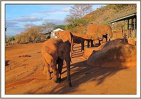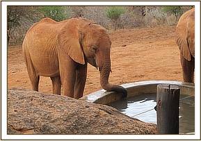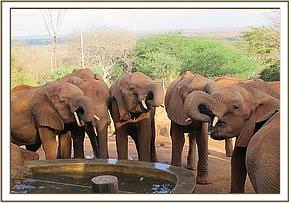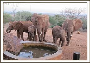 At 3.20 p.m. a herd of wild elephants who had been browsing behind the Malaika House, came to the stockade trough to take water, leaving just before Panda, Mbirikani and Mudanda raced in, eager for a drink, Shimba following slowly.