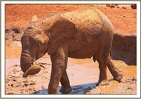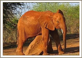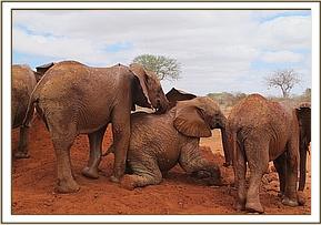 As the orphans were browsing out in the field, they noticed a wild herd of about 15 elephants heading their way. Tassia, Dabassa, Lesanju and Wasessa went to meet them and all the orphans browsed along with the wild herd, all the same red colour so it was difficult for the Keepers to discern who was who! Tassia, Taveta, Mzima, Rombo and Dabassa found wild age mates whom they engaged in tusking games while the older girls decided to “Nannie” the small wild calves. The wild herd separated from the orphans when the Keepers called them for the mudbath where they had a lot of fun.