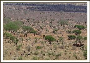As the orphans were browsing the slopes of the Hill they came across a tuskless wild cow with her two calves, one of whom was suckling. As soon as the Cow heard the Keepers’ voices, she threatened to charge, leaving the Keepers sheltering behind their Orphaned herd! As soon as the calf had finished suckling, the wild cow headed towards other wild elephants who were feeding below leaving our orphans to feast on vegetation up the hill. Many animals were grazing below along with wild elephants - a group of ostriches, Peters’ gazelles and Hartebeest.