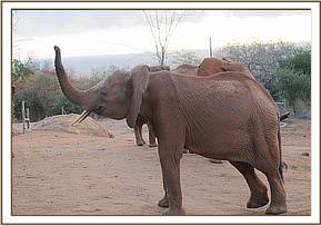 Kivuko and Taveta competed leadership of the Orphans, arriving at the top of Mazinga hill ahead of all the others. Tassia climbed a huge flat rock, swinging his trunk and flapping his ears as he enjoyed the cooling breeze. All browsed until noon opting for a dustbath up the hill, rather than come down for a wallow at the Stockades. Meanwhile Ex Orphan Lissa and her wild-born calves came to drink from the Stockade water trough, and enjoying some Lucerne. They remained at the Stockades for about 1 hour before leaving.