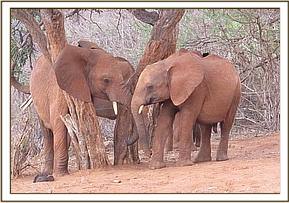 It was another mud-bathing day for the Orphans, who went to the Waterhole soon after l0 a.m. and all wrestled for a space within. The Big Girls began to extend the waterhole gauging clumps of earth from the banks while others demonstrated their butt scratching and wallowing skills, all trying to out-do one another!